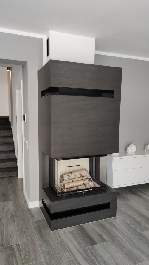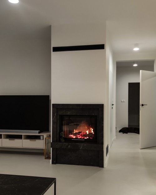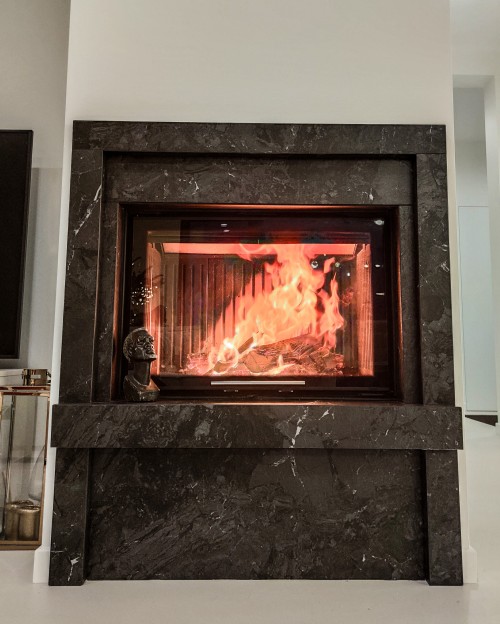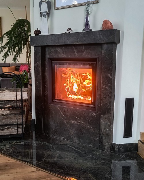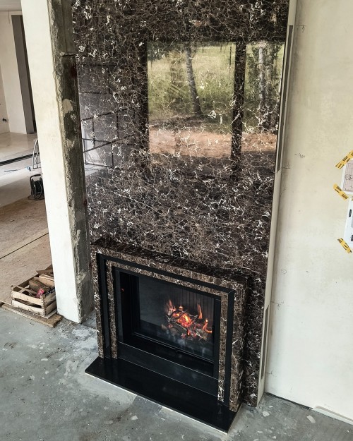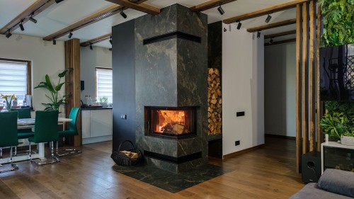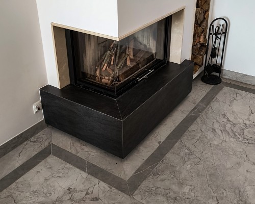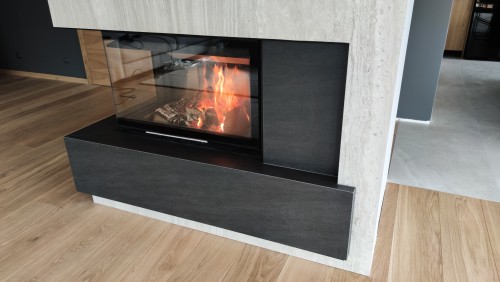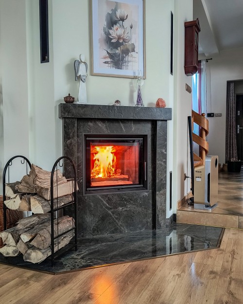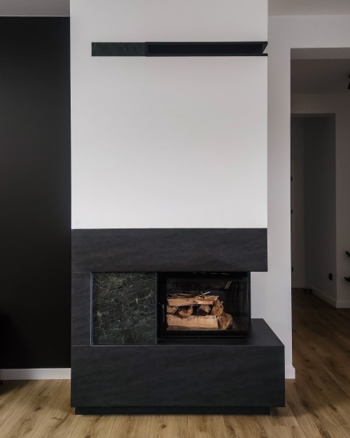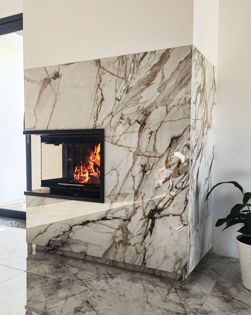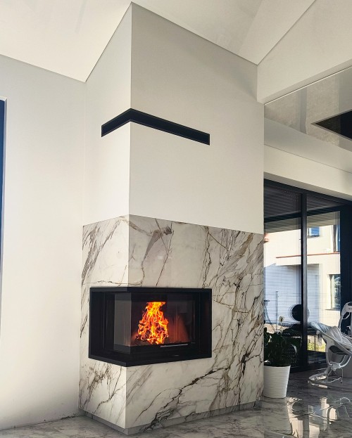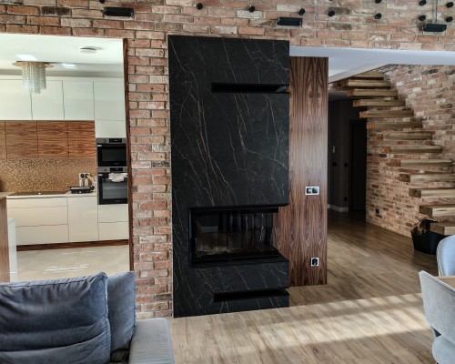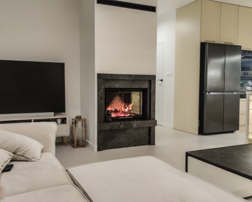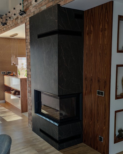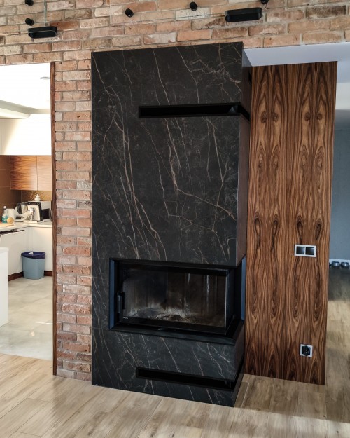 Kominki w całości wykończone kamieniem spiekanym, marmurem bądź granitem.