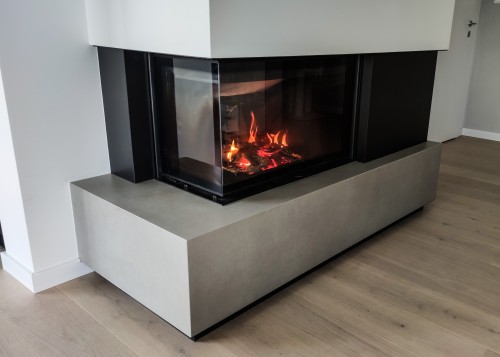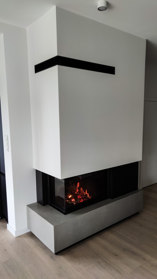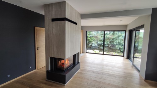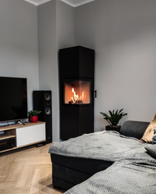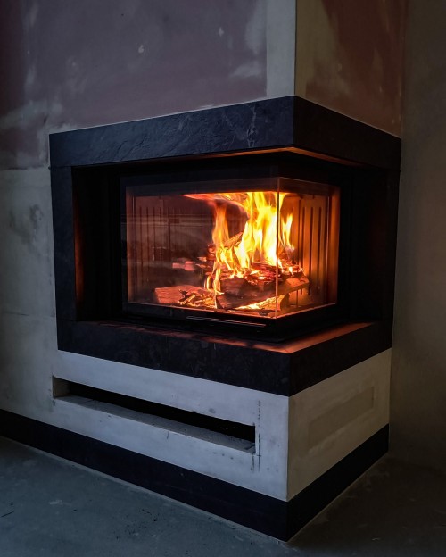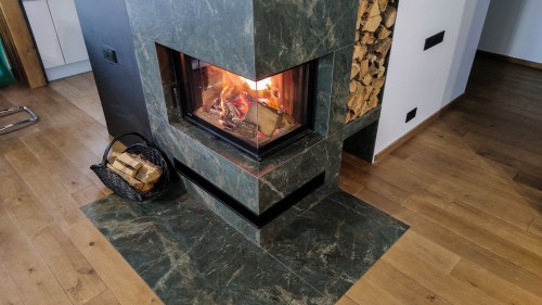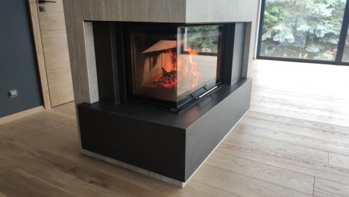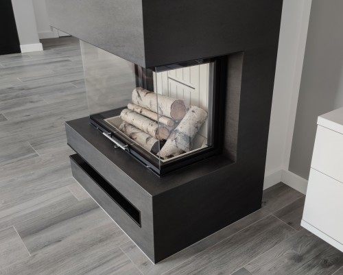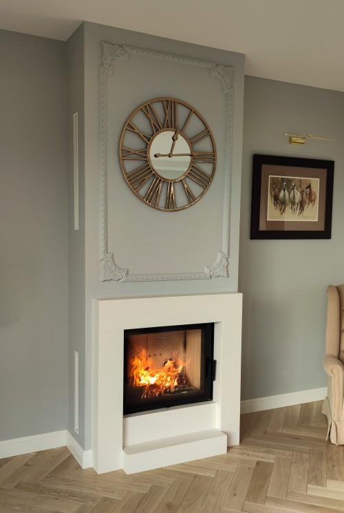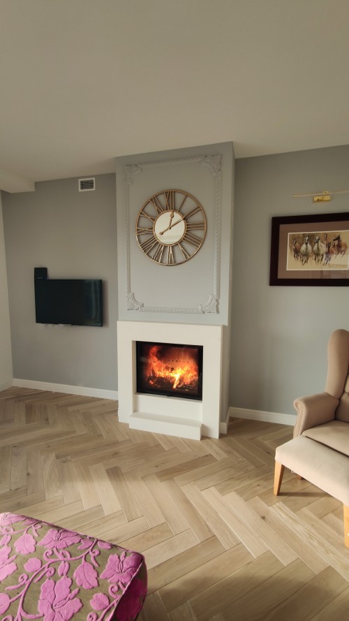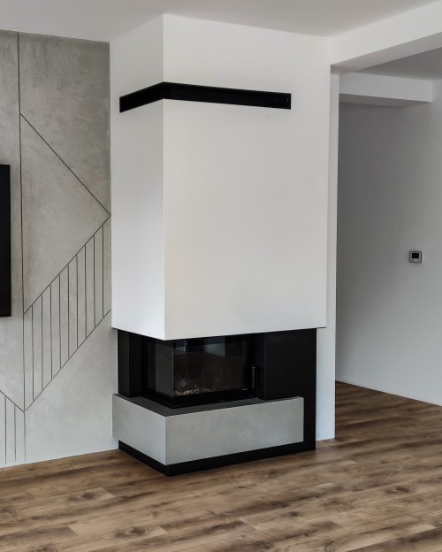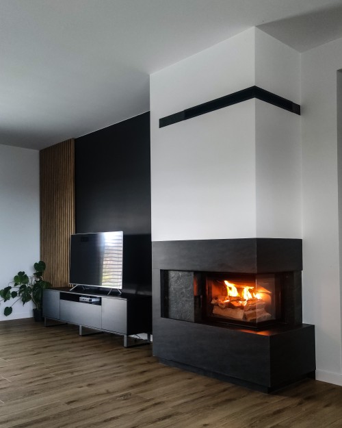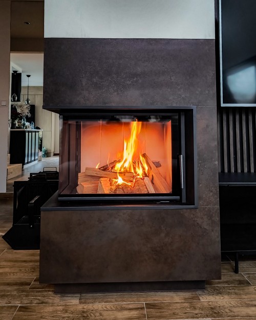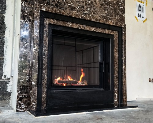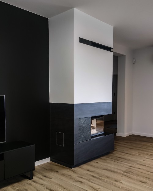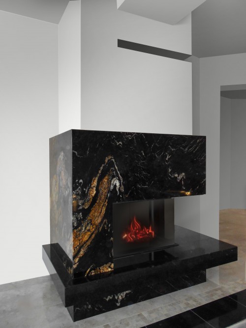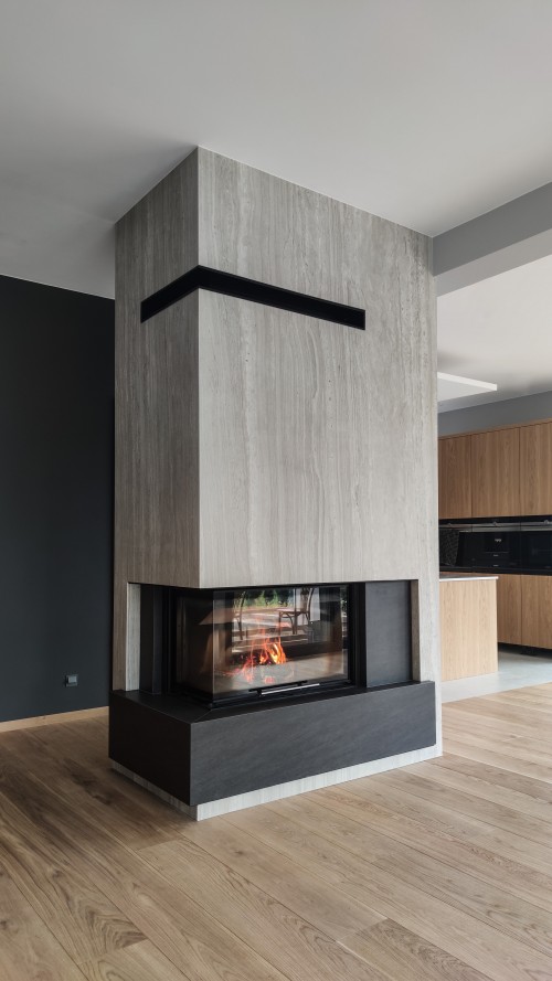 Kominki w całości wykończone kamieniem spiekanym, marmurem bądź granitem.